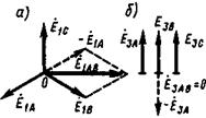 Рис. 1.28. Векторные диаграммы ЭДС основной (а) и третьей (б) гармоник трехфазного трансформатора Амплитуда ЭДС третьей гармоники в трансформаторной группе может достигать 45—65% от амплитуды основной гармоники. Однако следует отметить, что линейные ЭДС (напряжения) остаются синусоидальными и не содержат третьей гармоники, так как при соединении обмоток звездой фазные ЭДС е3A, е3B и езс, совпадая по фазе, не создают линейной ЭДС. Объясняется это тем, что линейная ЭДС при соединении обмоток звездой определяется разностью фазных ЭДС. Так, для основной гармоники (рис. 1.28, а) линейная ЭДС
