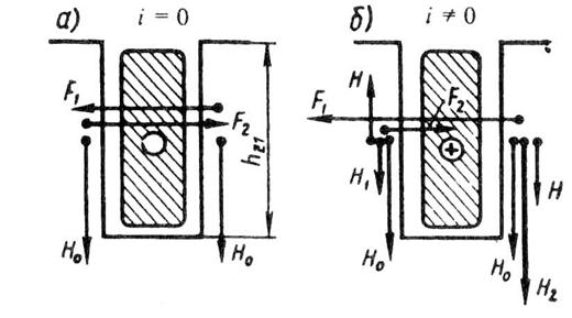 тока в проводе, лежащем в пазу сердечника, с внешним магнитным полем, приложена главным образом не к проводу, а к зубцам, образующим стенки паза. Это явление переноса механических сил с проводов на зубцы объясняется возникновением пондеромоторных сил, которые появляются в магнитном поле на границе раздела двух сред с разной магнитной проницаемостью и всегда направлены от среды с большей магнитной проницаемостью к среде с меньшей магнитной проницаемостью (в рассматриваемом случае из зубца в паз). Для пояснения этого явления рассмотрим два зубца с напряженностью поля Н0 в каждом и относительной магнитной проницаемостью μr и паз между этими зубцами высотой hz и длиной li. При отсутствии тока в проводнике пондеромоторные силы F1 = F2 ≈ 0,5 μ0 (μr - 1) H02 li hz, (11.12) а результирующая пондеромоторная сила Fп = F2 – F1 =0 (рис. 11.5, а). С появлением тока I в проводнике напряженность Н1 поля в левой стенке паза уменьшится, а напряженность H2 в правой увеличится (рис. 11.5, б): H1 = H0 — H; H2 = H0 + H, (11.13) где H ≈ i / (2hz) (11.14) - напряженность поля от тока i. В этом случае с учетом (11.13) и (11.14) результирующая пондеромоторная сила (Н), действующая на стенку правого зубца, Fп = F1 – F2 ≈ 0,5 μ0 (μr – 1) li hz [(H0 + H)2 – (H0 - H)2 ] =2 μ0 (μr – 1) H0 H li hz = = μ0 (μr – 1) H0 li i (11.15) Сила (Н), действующая непосредственно на проводник в пазу, Fпр ≈ μ0 H0 li i (11.16) т. е. она вμr – 1 раз меньше силы, действующей на зубец сердечника. При реальных значениях магнитной индукции в зубцах сердечника сила, действующая на зубец Fп, в 50—100 раз больше силы, действующей на проводник, расположенный в пазу Fnp. Контрольные вопросы 1. Из каких участков состоит магнитная цепь асинхронной машины? 2. Какова цель расчета магнитной цепи асинхронной машины? 3. Как влияет выбор значения магнитной индукции в воздушном зазоре на свойства асинхронного двигателя? 4. Какие марки листовых электротехнических сталей применяют в асинхронных двигателях? 5. Что учитывает коэффициент воздушного зазора? 6. Как определить коэффициент магнитного насыщения? 7. Чем обусловлены индуктивные сопротивления рассеяния обмоток статора и ротора асинхронного двигателя? 8. Почему электромагнитные силы в асинхронном двигателе приложены главным образом к зубцам сердечника, а не к проводам обмотки?