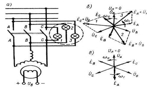 На электрических станциях обычно устанавливают несколько синхронных генераторов, включаемых параллельно для совместной работы (рис. 21.1). Наличие нескольких генераторов вместо одного суммарной мощности дает преимущества, объясняемые теми же соображениями, которые были изложены применительно к параллельной работе трансформаторов (см. § 2.2). При включении синхронного генератора в сеть на параллельную работу необходимо соблюдать следующие условия: ЭДС генератора Приведение генератора в состояние, удовлетворяющее всем указанным условиям, называют синхронизацией. Несоблюдение любого из условий синхронизации приводит к появлению в обмотке статора больших уравнительных токов, чрезмерное значение которых может явиться причиной аварии. Включить генератор в сеть с параллельно работающими генераторами можно или способом точной синхронизации, или способом самосинхронизации Способ точной синхронизации. Сущность этого способа состоит в том, что, прежде чем включить генератор в сеть, его приводят в состояние, удовлетворяющее всем вышеперечисленным условиям. Момент соблюдения этих условий, т. е. момент синхронизации, определяют прибором, называемым синхроноскопом. По конструкции синхроноскопы разделяют на стрелочные и ламповые. Рассмотрим процесс синхронизации генераторов с применением лампового синхроноскопа, который состоит из трех ламп 1, 2, 3, расположенных в вершинах равностороннего треугольника. При включении ламп по схеме «на погасание» (рис. 21.2, а) момент синхронизации соответствует одновременному погасанию всех ламп. Предположим, что звезда ЭДС генератора вращения