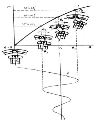 Рис. 21.7. Колебания синхронной машины: 1- угловая характеристика; 2 – график затухающих колебаний ротор