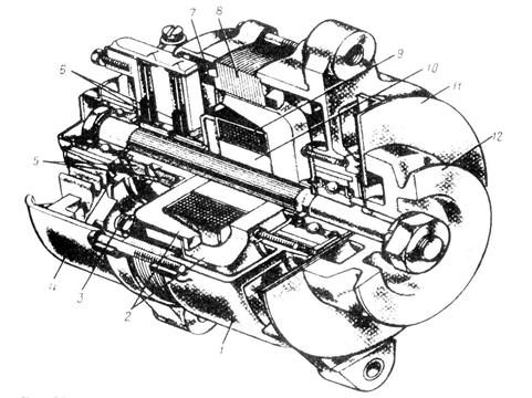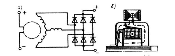 Рис.23.10. Принципиальная схема включения (а) и магнитная система синхронного генератора (б) с когтеобразными полюсами Рассматриваемый генератор отличается простотой конструкции, компактностью, надежностью и высокой технологичностью. Последнее достоинство имеет важное значение в условиях массового производства синхронных генераторов с мощности (менее 1 кВА) В схеме электрооборудования генератор включают параллельно с аккумуляторной батареей, и он работает с ней в буферном режиме, т. е. они дополняют друг друга в зависимости от величины нагрузки и частоты вращения приводного двигателя.