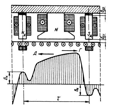 Рис. 27.7. Результирующее магнитное поле в воздушном зазоре машины с добавочными полюсами в генераторном (Г) и двигательном (Д) режимах