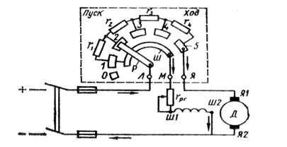 Одновременно через рычаг Р и шину Ш к сети подключается обмотка возбуждения, ток в которой в течение всего периода пуска не зависит от положения рычага Р, так как сопротивление шины по сравнению с сопротивлением обмотки возбуждения пренебрежимо мало. Пусковой ток якоря при полном сопротивлении пускового реостата