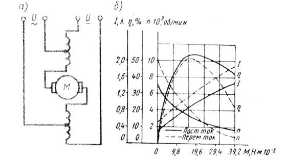 Рис. 29.17. Схема соединений и рабочие характеристики универсального коллекторного двигателя
