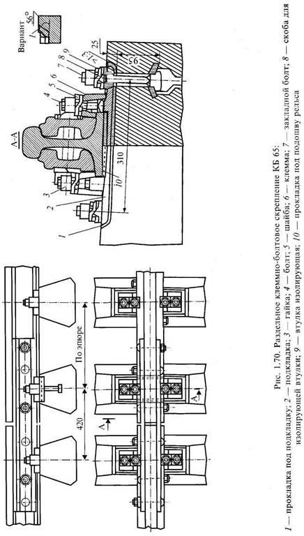 щиной 6—10 мм из резины, резинокор-да, интенсивность износа при этом снижается в 2,7—3,7 раза. Вторыми по распространению являются раздельные скрепления КД (рис. 1.69). Рельс прижимается к подкладке двумя клеммами, а подкладка к шпале четырьмя шурупами. Прижатие клеммы обеспечивает болт с гайкой и шайбой. Под подошву рельса укладывают упругую прокладку. Достоинствами раздельных скреплений являются: - отсутствие вибрации подкладки, а - сильное прижатие рельсов к под - возможность смены рельсов без вы Недостатки этих скреплений: - большое количество деталей; - быстрое ослабление натяжения Более совершенным раздельным скреплением является скрепление Д 4 с упругими клеммами. Оно позволяет регулировать положение рельсов по высоте до 14 мм за счет изменения толщины подрельсовых прокладок. Скрепления для железобетонных опор. Типовым промежуточным скреплением для железобетонных шпал является раздельное клеммно-болтовое скрепление КБ (рис. 1.70), в котором рельс к подкладке прижимается жесткими клеммами, надеваемыми на клеммные болты. Под гайки клеммных болтов ставят упругие шайбы. Металлические подкладки укладывают на наклонную (для обеспечения подуклонки рельсов), заглубленную в тело шпалы на 15— 25 мм подрельсовую площадку. На бетон под подкладку укладывают резиновую прокладку, чтобы обеспечить электро- и виброизоляцию. Подкладка крепится к шпале закладными болтами. Недостатками конструкции скреплений КБ является многодетальность (21 деталь в каждом узле скреплений), материалоемкость (общая масса металлических и полимерных деталей на 1 км пути составляет соответственно 41,6 и 2,1 т). На 1 км пути около 16 тыс. болтов, содержание которых (очистка от грязи, смазка, подтягивание гаек) требует больших затрат. Кроме типовых скреплений КБ на участках пути с железобетонными шпалами в России используют бесподкладочное скрепление ЖБ.