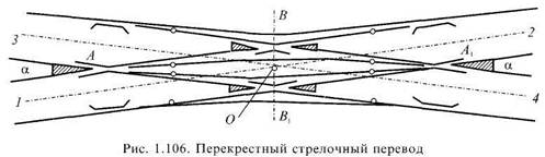 Используя перекрестные стрелочные переводы (рис. 1.106), осуществляют движение поездов по четырем направлениям: с 1 на 2; с 1 на 4; с 3 на 2 и с 3 на 4. Такой перевод заменяет собой два обыкновенных. При этом длина перекрестного перевода почти в два раза меньше длины, занимаемой двумя