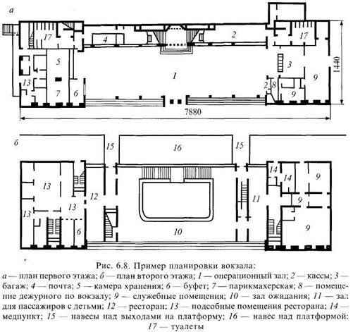 Вокзальный комплекс должен включать комплекс зданий, сооружений и устройств, необходимых для быстрого, безопасного и удобного выполнения операций, для обслуживания и перевозки пассажиров. Сюда включаются: пассажирские здания, багажные отделения, платформы, пешеходные мосты, тоннели и переходы, устройства для хранения багажа и ручной клади, почтовые и торговые киоски. Вокзалы, обслуживающие пассажиров дальнего следования, в зависимости от расчетной вместимости подразделяются на: - малые — вместимостью 50, 100, 150 и 200 пассажиров; - средние — свыше 200 до 700 пассажиров; - большие — свыше 700 до 1500 пассажиров; - крупнейшие — свыше 1500 пассажиров. Вокзалы должны быть оснащены новыми техническими средствами и системами автоматизации распределения мест и продажи билетов, справоч-но-информационной аппаратуры, механизации операций по погрузке, выгрузке и транспортировке багажа и грузобагажа, а также механизации операций по уборке помещений и пассажирских платформ. В пассажирских зданиях вокзала должны быть предусмотрены: кассовый зал, зал для пассажиров с детьми, пригородные кассы, залы ожидания, сервис-центр, предприятия общественного питания, которые в зависимости от вместимости и местных условий могут состоять из кафе, буфетов и ресторанов, магазин, комнаты отдыха, туалеты, видеозал. Если вокзалы располагаются в пунктах с большим транзитным пассажиропотоком, должны быть помещения для отдыха пассажиров, комнаты матери и ребенка. Справочное бюро, помещения дежурного по вокзалу, почты, телеграфа, междугородного телефона размещают в вестибюлях или вблизи от них, приближенно к путям следования основных потоков пассажиров. Камеры хранения ручной клади располагают вблизи путей следования пассажиров прибытия, и с учетом удобного пользования ими пассажиров отправления. На рис. 6.8 показано примерное расположение устройств здания вокзала. Здания вокзалов разрабатываются с учетом современных требований к архитектуре, и с учетом архитектуры города и привокзальной площади, чтобы вокзал органично вписывался в сложившийся архитектурный ансамбль города или населенного пункта. Новые вокзалы размещают с внешней стороны путей станции со стороны основной части селитебной территории населенного пункта, связывают их с промежуточными платформами с помощью переходов в разных уров-