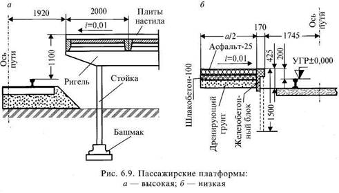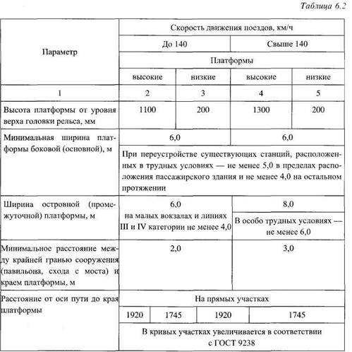 нях — тоннелей и пешеходных мостов. Предпочтение отдается тоннелям, которые имеют меньшие подъемы и спуски по сравнению с пешеходными мостами. Пешеходные мосты в Северной строительно-климатической зоне строят крытыми (остекленными, галерейного типа). Ширина тоннелей принимается не менее 3 м, высота тоннелей до выступающей конструктивной части — не менее 2,4 м. Ширина пешеходных мостов, предназначенная для прохода пассажиров, принимается не менее 2,25 м. Ширина сходов с пешеходного моста и входа в тоннель должна соответствовать ширине моста или тоннеля и быть не менее 2 м при двух выходах на платформу. Переходы, соединяющие основные и промежуточные платформы в уровне головки рельса, устраивают шириной не менее 3 м, а при выполнении багажных и почтовых операций — не менее 4 м. Пассажирские платформы предназначены для кратковременного ожидания поездов, посадки и высадки пассажиров, а также в необходимых случаях (по местным условиям) почтово-багажных операций. Число пассажирских платформ, их длина и ширина рассчитывается в зависимости от пассажиропотока. Платформы в зависимости от типа вокзала и расположения его относительно перронных путей различают основные (боковые), островные (промежуточные), тупиковые и распределительные, которые объединяют несколько тупиковых платформ. Платформы применяют высокие и низкие (рис. 6.9). Высокие платформы устраивают на крупных и крупнейших вокзалах, а также на вокзалах электрифицированных железных дорог с интенсивным пригородным движением, низкие платформы применяют на средних и малых вокзалах. Параметры пассажирских платформ приведены в табл. 6.2. На станциях, где возможен безостановочный пропуск поездов со скоростями свыше 140 км/ч по пути, смежному с платформой, расстояние от сооружений до края платформы должно быть не менее 3,0 м. Пассажирские платформы должны иметь навес для укрытия пассажиров от снега и дождя, а также излишней солнечной радиации. Длина навесов на малых вокзалах — не менее длины пассажирского здания, для средних — не менее 100 м, и для больших и крупнейших — по всей ширине платформы. Длина пассажирских платформ принимается равной длине обращающихся пассажирских поездов. На вновь сооружаемых станциях предусматривают удлинение платформ до 650—850 м, а по заданию ОАО»РЖД» до 1000 м. На привокзальной площади должны быть предусмотрены подъезды автомашин и дорожки для пешеходов к местам перехода пассажиров через железнодорожные пути. Планировка привокзальной площади должна обеспечивать удобное и безопасное передвижение пешеходов и использование ими всех видов городского транспорта. Остановки автобусов, трамваев, троллейбусов, метро следует располагать как можно ближе к вокзалу, как правило, не далее 100 м от основных входов-выходов пассажирского зда-