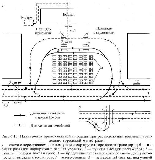 ния. Пассажирам должен быть предусмотрен безопасный, удобный и возможно короткий переход от остановок местного транспорта до железнодорожных платформ. Привокзальную площадь следует располагать со стороны основной части селитебной территории, при этом предусматриваются удобные взаимосвязи привокзальной площади, пассажирского здания и платформ. Пример планировки привокзальной площади приведен на рис. 6.10. Здание вокзала должно располагаться на расстоянии не менее 20 м от оси ближайшего пути, а на линиях, на которых предусматривается движение пассажирских поездов со скоростями 140—200 км/ч — не менее 25 м. Расстояние от края перрона до здания вокзала должно быть не более 50 м.