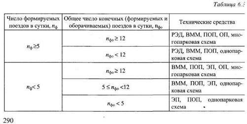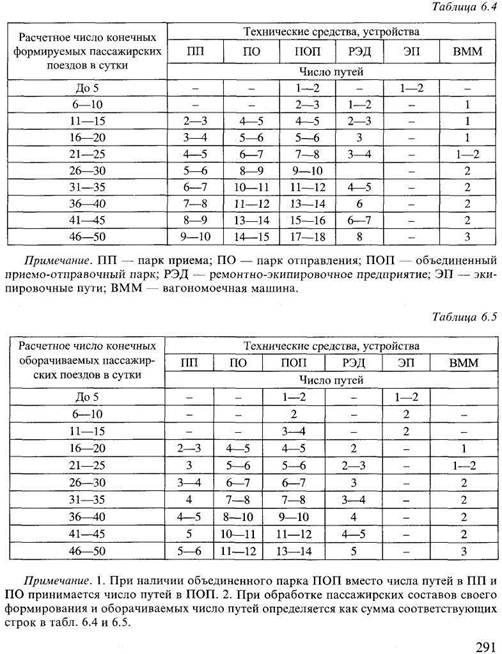 любой момент времени. Потребное число приемо-отправочных путей для формируемых и оборачиваемых пассажирских составов дальнего следования в ориентировочных расчетах может быть принято по табл. 6.4 и 6.5. Для детальных расчетов путевого развития применяют метод имитационного моделирования работы станции, с учетом взаимного расположения парков станции, наличия в составах поездов почтовых, багажных вагонов и вагонов-ресторанов, неравномерности поступления в обработку составов разных категорий.