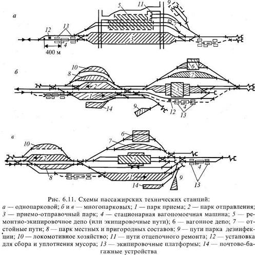6.8. Назначение и комплекс устройств пассажирских технических станций Основным назначением пассажирских технических станций является комплексная подготовка пассажирских составов в рейс, переформирование составов, погрузка выгрузка почты, багажа и грузобагажа, формирование почтово-багажных поездов, отцепочный и безотцепочный ремонт пассажирских вагонов. Комплексная подготовка пассажирских составов в рейс включает: технический осмотр, наружную очистку, обмывку и внутреннюю уборку, ремонт внутреннего оборудования, санитарную обработку, экипировку постельными принадлежностями, топливом и водой и переформирование составов. На пассажирской технической станции проходят экипировку и межпоездной ремонт составы, приписанные к ней и оборачиваемые, приписанные к другим станциям. Для выполнения операций по комплексной подготовке составов в рейс, пассажирские технические станции должны иметь следующие устройства: - парки приема, где выполняется грубая очистка вагонов; - вагономоечные машины стационарные или передвижные. Если станция формирует в рейс более 5 составов в сутки, необходимо сооружение ремонтно-экипировочного предприятия РЭД, где концентрируются все основные экипировочные операции: техническое обслуживание, в том числе экипировка составов водой, углем, подзарядка аккумуляторных батарей, экипировка вагонов-ресторанов. Ремонтно-экипировочные предприятия обеспечивают условия для высокого качества технического осмотра и ремонта пассажирских составов. В Северной строительно-климатической зоне в I, II и III климатических районах обмывку и ремонт пассажирских вагонов выполняют в крытых цехах. При программе деповского ремонта 1000—1500 вагонов в год предусматривают ремонтные предприятия, их следует устраивать в пунктах формирования пассажирских составов. Ремонтные предприятия следует располагать на общей территории с ремонтно-экипировочным предприятием, чтобы использовать общие коммуникации. В пунктах газовой дезинфекции предусматривают служебные и бытовые помещения, два тупиковых пути длиной 105 (210) м при одновременной обработке 8(16) вагонов. Пути газовой обработки размещают на расстоянии: 25 м от железнодорожных путей, 50 м от служебных зданий и 100 м от жилых зданий. Если вагоны-рестораны не экипируются в РЭД, для них устраивают специальные пути для технического обслуживания и экипировки. На пассажирских технических станциях также располагают мусоросборники, склад топлива, системы контроля готовности пассажирских составов в рейс, специальные пути для погрузки-выгрузки почтовых и багажных вагонов. Необходимое техническое оснащение пассажирских технических станций зависит от объема и характера выполняемой работы и приведено в табл. 6.3. Число приемо-отправочных путей на пассажирской технической станции должно быть не менее числа одновременно находящихся на станции составов в