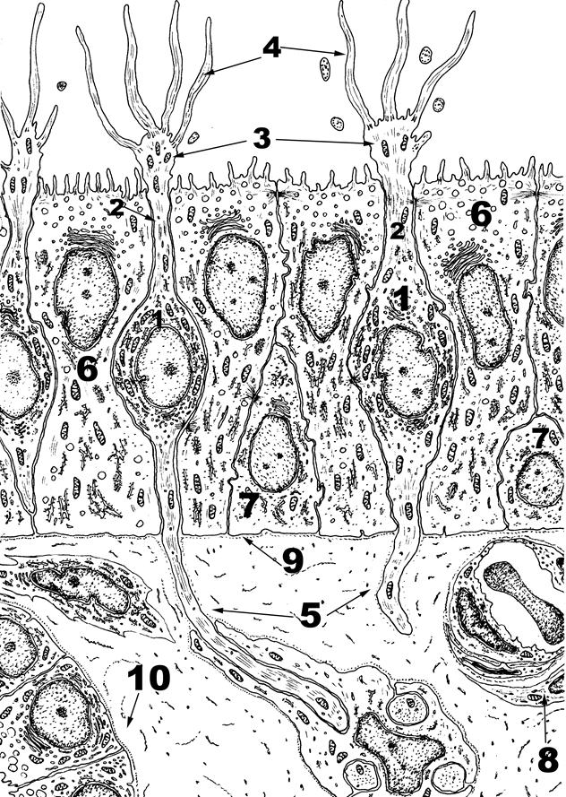 Фрагмент какого органа изображен на рисунке? Назовите структуры, обозначенные цифрами. Рис. 4. Обонятельный эпителий полости носа. 1.Обонятельная нейросенсорная клетка. 2.Дендрит. 3.Луковица дендрита. 4.Ресничка. 5.Аксон. 6.Поддерживающий эпителиоцит. 7.Базальный эпителиоцит. 8.Кровеносный капилляр. 9.Базальная мембрана. 10.Фрагмент концевого отдела железы.