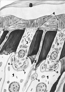 Назовите фрагмент органа, типы клеток, структуры, обозначенные цифрами. Рис. 7. Вкусовая почка. 1.Опорная (поддерживающая) «темная» клетка. 2. Опорная (поддерживающая) «светлая» клетка. 3.Сенсоэпителиальная (рецепторная) клетка. 4.Базальная малодифференцированная клетка. 5.Нервное волокно. 6.Вкусовая пора. 7. Периферические (перигеммальные) клетки. 8.Собственная пластинка слизистой оболочки языка. Вкусовые почки располагаются в многослойном эпителии сосочков языка, за исключением нитевидных сосочков. Вкусовая почка имеет эллипсоидную форму. Состоит из плотно прилежащих друг к другу клеток, количество которых колеблется от 40 до 60. Воспринимает вкусовые раздражения пищевые и непищевые. Источником развития клеток во вкусовых почках является многослойный эпителий языка, где происходит их дифференцировка под индуцирующим влиянием врастающих нервов (7, 9, 10 пар черепно-мозговых нервов). Среди них различают сенсоэпителиальныне клетки (3), располагающиеся на базальной мембране. Апикальная поверхность имеет микроворсинки между которыми электронноплотное вещество с высокой активностью фосфатаз, большим содержанием мукопротеидов, которые играют роль адсорбента, с встроенными в цитолемму рецепторными белками. Конформационные (пространственные) изменения рецепторных белков приводят к изменению проницаемости мембран сенсоэпителиальных клеток и генерации потенциалов действия, которые с сенсоэпителиальной клетки переходят на нервное окончание, контактирующее с базальным полюсом клетки. В базальной части располагается овальной формы ядро, и эта часть клетки образует синапсы с чувствительными нервными волокнами. Поддерживающие клетки имеют вытянутую форму с овальным ядром в центральной части клетки, комплекс Гольджи, гр.и агр. ЭПС, митохондрии. Они отделяют сенсоэпителиальные клетки друг от друга. Базальные малодифференцированные клетки (4) конической формы, располагаются на базальной мембране. Имеют небольшой обьем цитоплазмы вокруг ядра. Слабо развиты органеллы. Эти клетки способны к митотическому делению и служат источником обновления сенсоэпителиальных и поддерживающих клеток. Периферические (перигеммальные) клетки (7) располагаются на поверхности вкусовой луковицы. Имеют серповидную форму. Вероятно, они выполняют разграничительную функцию, отделяя вкусовую почку от эпителия сосочка. Орган вкуса у новорожденных хорошо развит. Количество вкусовых почек в грудном возрасте больше, чем у взрослого. С возрастом темпы обновления клеток замедляются, количество вкусовых почек уменьшается, появляются нарушения вкусовой чувствительности. Это может быть связано с дистрофическими изменениями в луковицах, разрушении рецепторов языка. В старческом возрасте снижается в большей степени чувствительность на сладкое, а наиболее устойчивым является восприятие соленого. Механизм вкусовой рецепции: при попадании пищи в ротовую полость, молекулы пищевых веществ захватываются рецепторными белками, каждый из которых воспринимает определенный вкус, изменяется потенциал сенсоэпителиальных клеток (изменяется проницаемость цитолеммы, т.е. изменяется состояние ионных каналов), меняется концентрация медиаторов внутри клетки. Через синапс потенциал действия передается на дендриты нейронов, тела которых находятся в ганглиях лицевого, 