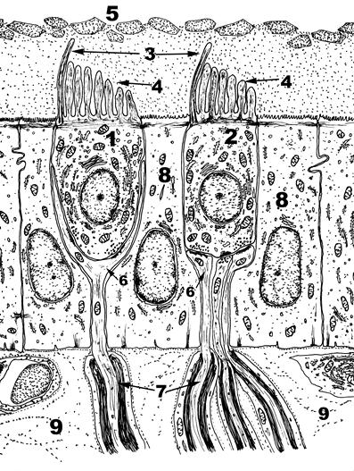 Назовите фрагмент органа, типы клеток, структуры, обозначенные цифрами. Рис. 6. Фрагмент макулы мешочков (орган равновесия). 1.Грушевидный эпителиоцит (рецепторная клетка I типа). 2.Столбчатый эпителиоцит (рецепторная клетка II типа). 3.Киноцилия. 4.Стереоцилия. 5.Отолитовая мембрана с отолитами. 6.Нервные окончания. 7.Нервные волокна. 8.Поддерживающий эпителиоцит. 9.Соединительная ткань. Рецепторные клетки в маточке и мешочке расположены не повсеместно, а образуют скопления, которые называют пятна (макулы). Они выстланы эпителием, располагающимся на базальной мембране. Среди клеток выделяют рецепторные и опорные. Грушевидный эпителиоцит (1) имеет расширенную базальную часть к которой прилежат нервные окончания (6) в виде чаши. Столбчатые эпителиоциты (2) имеют призматическую форму. К их базальной части так же прилежат нервные окончания (6). На апикальной поверхности клеток неподвижные стереоцилии (4) и одна подвижная киноцилия (3). Поддерживающие эпителиоциты (8) имеют призматическую форму с многочисленными микроворсинками на апикальной поверхности. Отолитовая мембрана (5) представляет собой студенистое вещество (гликопротеины) покрывающее макулы. В нее погружены стереоцилии и киноцилии. На ее поверхности располагаются кристаллы карбоната кальция – отолиты. При потере равновесия смещается отолитовая мембрана и соответственно изменяется положение стереоцилий и киноцилий: при смещении стереоцилий в сторону киноцилии клетка возбуждается, а противоположный эффект вызывает торможение.