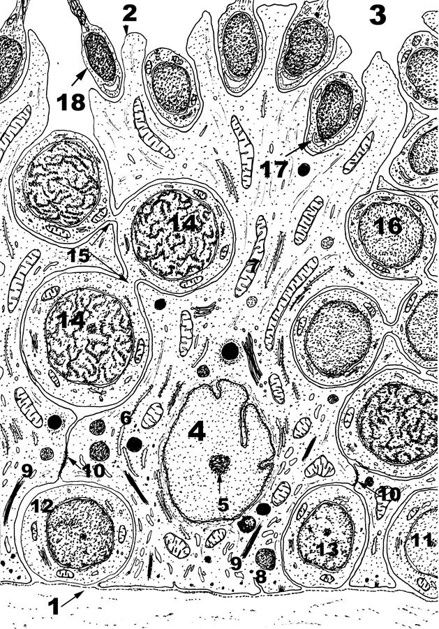 Дайте характеристику клеток в соответствии со стадиями изображённого процесса. Назовите структуры, обозначенные цифрами. Рис. 3. Сперматогенный эпителий. Сустентоциты (Клетки Сертоли). 1. Базальная мембрана. 2. Апикальная поверхность сустентоцита. 3.Просвет канальца. 4.Ядро. 5.Ядрышко. 6.грЭПС. 7. Митохондрии. 8.Лизосомы. 9. Кристаллы (включения). 10.Контакты соседних клеток. Предшественники сперматозоидов на разных стадиях дифференциации. В базальном отделе эпителия: 11 – сперматогония А светлая, 12 – сперматогония А тёмная, 13 – сперматогония В; в адлюминальном отделе эпителия: 14 – сперматоциты 1-го порядка, 15 – цитоплазматические мостики между клетками, 16 – сперматоцит 2-го порядка, 17 – сперматида ранняя, 18 – сперматида поздняя. Сперматогенный эпителий выстилает извитые канальцы яичка и включает два типа клеток: сустентоциты (клетки Сертоли) и сперматозоиды с предшественниками на разных стадиях дифференцировки. Сустентоциты, или поддерживающие клетки, основанием лежат на базальной мембране (1), апикальной частью (2) обращены в просвет канальца (3). Ядро клетки (4) чаще неправильной формы, располагается в базальной части, оно крупное, светлое, имеется ядрышко (5). В цитоплазме хорошо развиты органеллы: грЭПС (6), митохондрии (7), лизосомы (8). В базальной части находятся включения – кристаллы (9), состоящие из филаментов (функция неясна). Сустентоциты обеспечивают развитие сперматозоидов, предшественники которых охвачены отростками сустентоцитов, находясь на разных уровнях - этажах. Кроме того, сустентоциты формируют друг с другом плотные контакты (10), разделяющие сперматогенный эпителий на базальное и адлюминальное пространство. Базальный отдел (нижний этаж) содержит сперматогонии, лежащие на базальной мембране, которые делятся митозом и подобны соматическим клеткам. Базальный отдел обменивается различными веществами с интерстицием яичка. В адлюминальном (околопросветном) отделе вступившие в мейоз предшественники сперматозоидов изолированы от системы крови и лимфы. Клетки Сертоли являются ведущими в создании гематотестикулярного барьера, предотвращающего иммунную реакцию на развивающиеся сперматозоиды. В базальном отделе эпителия располагаются сперматогонии типа А. Их по степени конденсации хроматина делят на светлые (11), находящиеся в непрерывно следующих друг за другом клеточных циклах, и тёмные (12), или резервные, редко вступающие в митоз. Сперматогонии типа В (13), образующиеся из светлых сперматогоний типа А, имеют округлые ядра и конденсированный хроматин, делятся митозом, т.е. происходит стадия размножения сперматогенеза. Их дочерние клетки – сперматоциты 1-го порядка (14), связанные друг с другом цитоплазматическими мостиками (15), образуя синцитий, увеличиваются в размерах, проходя стадию роста, прекращают делиться митозом и вступают в мейоз, при этом перемещаются из базального в адлюминальное пространство канальца. Сперматоциты 2-го порядка (16), образующиеся в стадию созревания в результате 1-го деления мейоза, меньше по размерам своих предшественников, располагаются над сперматоцитами 1-го порядка. У просвета канальца располагаются образованные в результате 2-го деления мейоза гаплоидные сперматиды: сначала в виде округлых клеток – ранние (17), на этой стадии разрываются цитоплазматические мостики между клетками, затем п
