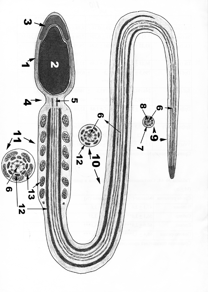 Рис. 4. Сперматозоид. 1.Головка. 2.Ядро. 3.Акросома. 4.Шейка. 5.Центриоль. 6.Аксонема. 7.Периферические дуплеты микротрубочек аксонемы. 8.Центральный дуплет микротрубочек аксонемы 9. Дистальный (концевой) отдел хвоста. 10.Проксимальный (главный) отдел хвоста. 11. Промежуточная часть хвоста.12.Фибриллы. 13. Митохондрии.