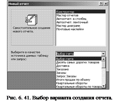 В начале создания отчета в окне диалога Новый отчет выбирают один из шести вариантов создания отчета (рис. 6.41)