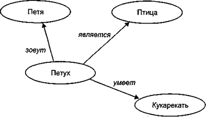 Продукционные модели часто используются в промышленных (экспертных системах. Семантические сети. Семантической сетью называется система [понятий и отношений между ними, представленная в форме ориен-|тированного графа. Это одна из наиболее гибких и универсальных |форм моделей знаний. На рис. 10.3 приведен пример, представляющий в форме графа сведения, заключенные в предложении: «Петух Петя является птицей, и он умеет кукарекать».