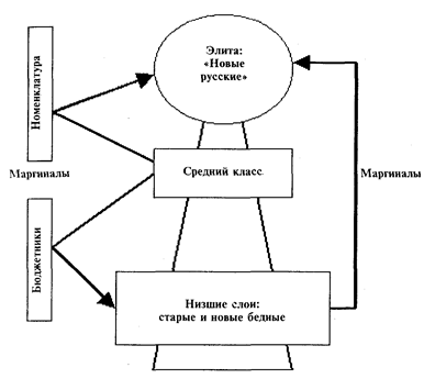Схема 11.3. Вторая волна маргинализации. В результате перехода российского общества в 90-е годы от социализма к капитализму в социальной структуре произошли серьезные трансформации. В состав новых русских (элита) вошли представители из низших слоев. Средний класс поляризовался, распавшись на два потока: часть (номенклатура и разночинцы) пополнили элиту, а другая часть (“новые бедные”) пополнила ряды бедных.