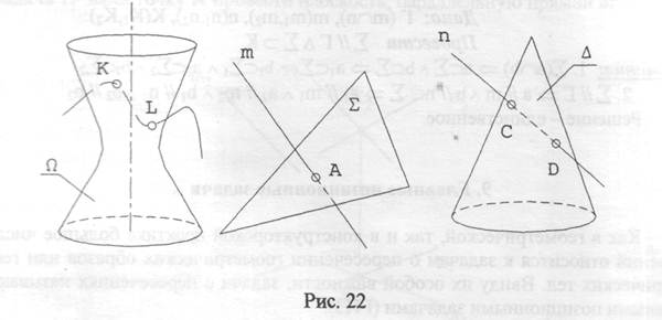 Решение: 1. ˄ ╨П2; 2. r = ˄ 3. N = r Так как для построения линии пересечения двух плоскостей - прямой - надо знать, как минимум, две точки, проводим еще один посредник (О.). Тогда: 4. Ω ╨П2; 5. m=Ω 6. М = m 7. К = M То, что мы здесь проделали, можно проиллюстрировать рис. 30. Заметим, что задача построения каждой из линий r, р, m и n - задача на второй случай пересечения, то есть, решение 2 ГПЗ для случая пересечения 3 к решению четырёх задач на второй случай пересечения!