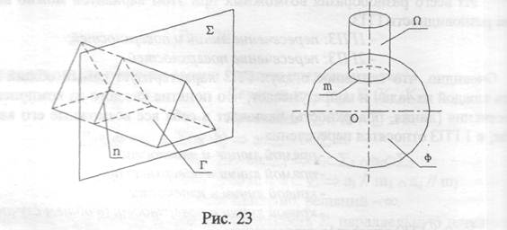 - плоскостей; - плоскости и поверхности; - поверхностей. Сущность всякой задачи на пересечение состоит в определении общего элемента, который будем называть искомым геометрическим образом. Очевидно, в 1-й ГПЗ это - точка или несколько (конечное число) точек (рис.22). Во 2-й ГПЗ искомым геометрическим образом является линия (рис.23). Искомый геометрический образ как результат пересечения заданных образов всегда принадлежит одновременно обоим заданным пересекающимся геометрическим образам и, очевидно, может быть определен: - непосредственно, исходя из свойств пересекающихся образов; - через посредство свойств нового геометрического образа