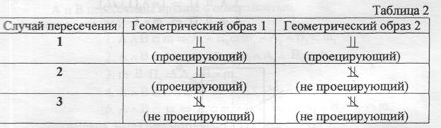 Направление методики решения предполагает использование проецирующих свойств геометрических образов. Поскольку геометрические образы могут быть как проецирующие, так и не проецирующие, очевидно, что как для 1 ГПЗ, так и для 2 ГПЗ при всем многообразии вариантов возможно существование трех случаев пересечения: Случай 1. Оба пересекающихся геометрических образа проецирующего характера; Случай 2. Один из пересекающихся геометрических образов проецирующего характера, а второй — не проецирующий; Случай 3. Оба пересекающихся геометрических образа - непроецирующего характера. Имея в виду то определение главной проекции геометрического образа, которое было дано ранее, очевидно, можно утверждать, что в случае 1 непосредственно на чертеже можно указать обе проекции искомого геометрического образа; в случае 2 непосредственно на чертеже можно определить одну проекцию искомого геометрического образа; В случае 3 определение проекций искомого геометрического образа потребует введения нового геометрического образа-посредника, обладающего свойствами проецирующих образов. Эти соображения вытекают из того, что точка, линия, фигура, принадлежащ ая проецирующему геометрическому образу, будет иметь свои одноименные проекции, совпадающие с главной проекцией этого образа. Все высказанное позволяет не только систематизировать все возможные случаи пересечения, но и алгоритмизировать сам процесс решения задач для все трех случаев. Самое главное из всего вышеизложенного о главных позиционных задачах (ГПЗ) можно объединить в двух таблицах, полезных для использования при решении задач о пересечении геометрических образов.