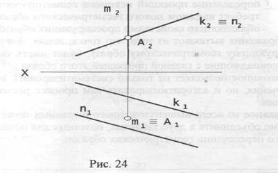 Задача 1. Даны прямая m(m1,m2) и плоскость Σ(n//k). Требуется определить точку А пересечения прямой m и плоскости Σ(n//k). Решение(рис.24): 1. А 2. А 1. m1 ╨ П1 => m1 ≡ A1 2. Σ ╨ П2 =>Σ2