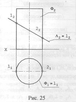Задача 2. Заданы плоскость ˄ (˄2) и цилиндрическая поверхность Ф(Ф1, Ф2,) Определить линию пересечения l плоскости ˄ с поверхностью Ф. Решение (рис. 25): 1.l 2. l 3. ˄ ╨ П2 => l2 ≡ ˄2(l2 4. Ф ╨ П1 => Ф1 ≡ l1
