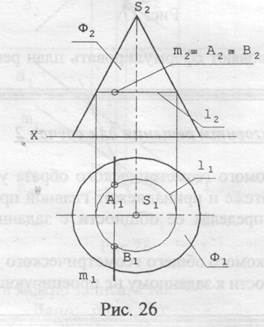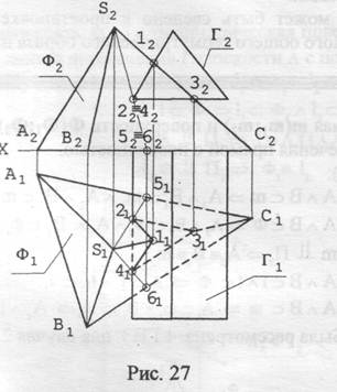 Существует еще один способ определения линии пересечения двух поверхностей общего положения. Наиболее часто он используется в случае пересечения: а) плоскостей; б) плоскости и поверхности; в) линейчатых поверхностей, из которых одна - гранная.