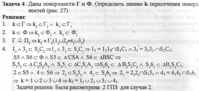 Алгоритм решения 2ГПЗ для случая 3 1. Обе заданные поверхности пересекают некоторыми посредниками 2. Строят линии пересечения каждой из заданных плоскостей или поверхностей с посредниками. 3. Определяют точки пересечения построенных линий пересечения. 4. Пункты 1-3 повторяют столько раз, сколько необходимо точек для 5. Последовательно соединяют полученные точки пересечения в некоторую линию, которая и будет искомой линией пересечения. В этом варианте решение может быть записано так (рис. 29):