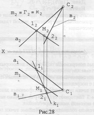 Примеры 3 и 4 позволяют сформулировать план решения задач для второго случая пересечения. Алгоритм решения для случая 2 1. Одна проекция искомого геометрического образа уже непосредственно задана на чертеже и принадлежит главной проекции проецирующего образа в пределах её общности с заданным не проецирующим образом. 2. Другая проекция искомого общего геометрического образа определяется по принадлежности к заданному не проецирующему образу. Задача 5.Заданы прямая m общего положения и плоскость общего положения Σ в виде двух пересекающихся прямых а и в. Определить точку М пересечения прямой m и плоскости Σ (рис. 28). Прежде, чем записать решение этой и следующей задачи, попробуем предложить следующий план решения. Алгоритм решения 1ГПЗ для случая 3 1. Через заданную прямую проводится плоскость-посредник; целесообразно, чтобы эта плоскость была проецирующего характера. 2. Строится линия пересечения заданной плоскости и плоскости-посредника (второй случай пересечения!). 3. Определяется точка пересечения заданной прямой и построенной линии пересечения, которая и будет искомой точкой. Эти же соображения можно сформулировать и в том случае, когда надо найти линию пересечения, а в качестве посредников выбраны некоторые поверхности. Сама же искомая линия будет представлена совокупностью точек.