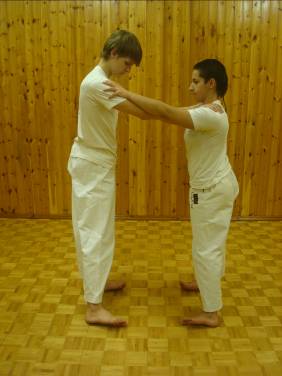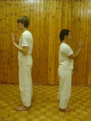 Закончив с ногами начинаем разминать корпус. Для этого поворачиваемся к ассистенту спиной и развернув плечи к нему, касаемся его ладоней, своими. То с одной стороны, то с другой. Ноги удерживаются на одном месте, а партнёр выполняет синхронно те же действия. Разогревая косые мышцы живота и спины, а также разминая позвоночник.