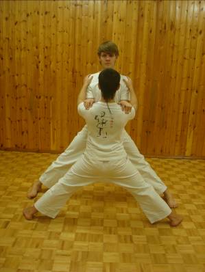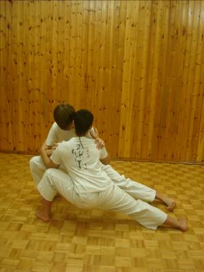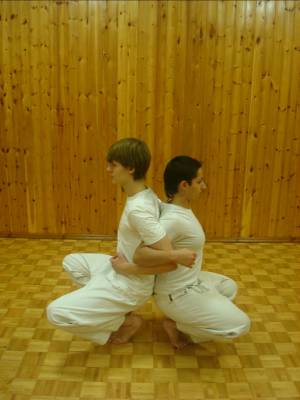 А так же приседаем и встаём развернувшись спиной к спине и выполнив локтевой захват поставив ноги пятками вместе, мысками наружу (мусуби-дати). Во время этого упражнения важно спину держать выпрямленной и сохранять равновесие.