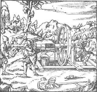 В IV тыс. до н. э. на северо-западных склонах гор Синайского полуострова обнаружена бирюза (от небесно-голубого до голубовато-зеленого цвета). Примерно в III тыс. до н. э. началась её добыча и выплавка меди. В эпоху фараонов к северу от залива Акаба в долине Тимна эксплуатировалось более двух сот шахт и штолен. Почти необозримый лабиринт полузасыпанных скальных штолен свидетельствует о больших горных разработках. Внутрь горы на разных уровнях были прорыты штольни и шахты глубиной от 4 до 8 м, а одна – до 36 м. Добыча руды велась при помощи каменных молотов и медных зубил. Руду и породу поднимали на поверхность при помощи канатного ворота мускульной силой (рис. 3.3). Рудокопы спускались в шахту и поднимались наверх по выбитым в каменной стене ступенькам. Значительная удаленность «малахитовой земли» от Нильской долины, мертвая скалистая местность, отсутствие воды и леса, необходимого для получения древесного угля, требовали решения организационных задач. Трудности были настолько значительны, что на протяжении многих тысячелетий горное производство приходилось часто и надолго приостанавливать. Вместе с медной рудой на Синайском полуострове добывали разнообразные по форме и цвету разновидности кварца – драгоценные камни, имевшие религиозно-культовое назначение: прозрачный горный хрусталь, синевато-фиолетовый аметист, небесно-голубой халцедон, кроваво-красный сердолик. В античных сказаниях упоминаются медные копи Фенана, расположенные на юге современной Иордании в районе между Мертвым морем и заливом Акаба. О промышленных масштабах, достигнутых здесь в V в. до н. э., свидетельствуют огромные (до 150 тыс. т) отвалы шлаков. Интересно, что после отработки шахты тщательно засыпались. Возможно, преследовалась цель охраны природы, называемая сегодня рекультивацией. Одной из первых стран, начавшей добычу и обработку золота, был Египет. Сначала люди открывали «россыпи» – рыхлые отложения, представлявшие собой продукты разрушения горных золотоносных пород, которые в течение длительного времени подвергались действию речных потоков. Особенно обильные россыпи блестящих золотых зерен были найдены к востоку от Фив, между Нилом и Красным морем. Однако размеры большинства зерен были слишком малы, чтобы собирать их руками. Древнейший способ извлечения таких крупинок золота заключался в промывке золотоносного песка. В Египте золото начали промывать примерно в 4000 г. до н. э. На Ближнем Востоке и в Египте широко применялось листовое золото – фольга. Фольгой покрывали самые различные предметы: как металлические, так и деревянные. Например, с помощью ковки или органического клея золотая фольга прикреплялась к изделиям из меди и серебра, а в последующем и бронзы. При этом золотое покрытие спасало металлы от коррозии. Вслед за искусством золочения возникло искусство холодной обработки чеканкой и получение золотой нити. В 3100 г. до н. э. возникла художественная обработка расплавленного золота с помощью литья. Золото стало первым металлом, из которого стали выковывать проволоку, который научились паять и полировать. Однако золотые песчинки и золотая пыль, полученные промывкой, не годились для изготовления фольги. Поэтому к такому золоту была применена технология обжига, такая же, как и для фаянсовых глазурей. Золото расплавляли в глиняных тиглях и пол
