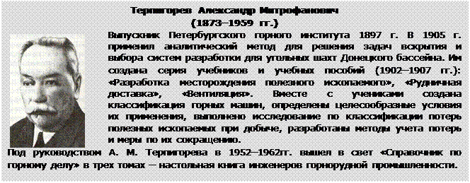 В первые десятилетия XX в. на угольных шахтах и в рудниках получили распространение некоторые средства механизации. Впервые для механизации бурения применили перфораторы, на угольных шахтах Донецкого бассейна появились первые врубовые машины и конвейеры для доставки угля по подземным выработкам, в золотодобывающей промышленности расширилось применение экскаваторов и особенно драг, осваивается гидромеханический способ разработки россыпных месторождений, более широко стали применять взрывание в различных отраслях горного дела. Открытие и разработка месторождений полезных ископаемых в дореволюционной России были основой для организации промышленного производства в стране, послужили стимулом для освоения Урала, Сибири и Дальнего Востока. Однако несовершенство горнодобывающего оборудования накладывало отпечаток на освоение открытых месторождений, в разработку вовлекались только месторождения с высоким содержанием металла в руде, как правило, неглубоко залегающие. Вследствие этого многие открытые месторождения не были вовлечены в разработку, большое количество месторождений было отработано частично, после чего рудники забрасывались. Несовершенные методы и техника разведки не позволили выявить месторождения на относительно больших глубинах и в труднодоступных местах.