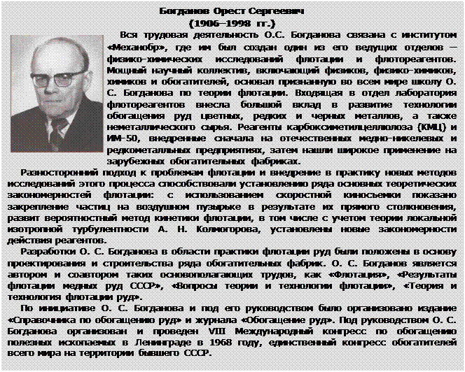 В 1901 г. на фабрике Дельпра (США) Поттер разработал новый способ флотации, с использованием которого было получено более 6 т цинкового концентрата, содержащего до 42 % цинка, из отвальной руды с содержанием цинка 20 %. Руду из отвалов, содержащую цинк в виде его сульфида – цинковой обманки загружали в горячий раствор серной кислоты или бисульфата натрия. При этом выделяющийся газ выносил на поверхность частички цинковой обманки. Примерно в это же время (1902 г.) Фолман в Италии запатентовал процесс, представляющий собой приложение процесса Басселей к сульфидным минералам. В 1892 г. после патента Нибелиуса был зарегистрирован ряд патентов на способы флотации ценных минералов, собирающихся в виде тонкой пленки на поверхности воды. В чан аппарата на поверхность воды равномерным тонким слоем подавали измельченную до 0,2–0,3 мм руду, предварительно обработанную маслом. Расход масла составлял около 200г на 1 т руды. Плавающие зерна с поверхности воды снимали конвейерные ленты и перевозили в маленький чан, в котором собирался концентрат. Хвосты флотации – потонувшие в большом чане минералы выгружались внизу. Этим методом в самом начале XX в. в США было получено свыше 300 тыс. т цинкового концентрата. В 1904 г. в России в Мариуполе была пущена одна из первых в мире флотационных фабрик, работающих по принципу масляной флотации. Фабрика перерабатывала графитовую руду Старо-Крымского месторождения. Однако пленочную флотацию вытеснила пенная флотация – как более эффективная. В 1905 г. компании «Минерал Сепарейшен» был выдан так называемый базисный патент, который считают началом современного пенно-флотационного процесса. Базисный патент собрал все наиболее существенное из того, что было известно в масляной флотации. Главное же в развитии масляной флотации – стремление к резкому снижению расхода масел, поэтому в базисном патенте указывалось, что в способе предусматриваются небольшие расходы реагентов: 0,02–0,5 % олеиновой кислоты или менее 1 % масла. Дальнейшее развитие процесса флотации связано с разработкой методов насыщения пульпы пузырьками воздуха путем его вдувания или засасывания вращающейся мешалкой (1906 г., Сульман, Паккард Балло, Чэпман). Иногда аэрация пульпы достигалась путем образования каскада в результате перелива пульпы или продувкой воздуха через ткань. Важным центром исследований в области обогащения в 1910 г. становится Брокен-Хилл (Австралия). При обогащении по плотности, которое применялось во всем мире до 1913 г., нельзя было отделить свинцовый блеск от цинковой обманки, и поэтому в отвалах накапливалось значительное количество свинца. В то время флотацией уже можно было получить удовлетворительное извлечение цинковой обманки, но вместе с ней извлекалась большая часть свинца, что затрудняло металлургическую плавку. Впервые процесс селективной флотации ввел в 1912 г. Листер, который обнаружил, что флотация галенита в щелочном растворе происходит значительно интенсивнее флотации цинковой обманки. В 1912 г. Лоури и Гринуэй применили при флотации депрессор свинцового блеска – бихромат натрия. В 1913 г. Бредфорд сделал важное для флотации открытие, установив активирующее воздействие медного купороса на цинковую обманку, получившее название «активации». С самого начала промышленного развития процесса флотации изобретались различные ти