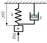 Рис.1.4. Механическая система, состоящая из пружины, груза и демпфера В качестве входной переменной рассматривается вынуждающая сила F(t), а выходной переменной является расстояние до точки подвеса y(t). В этом случае вертикальные колебания груза можно описать уравнением: