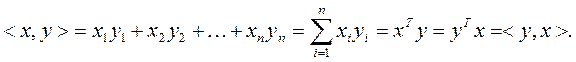Скалярное произведение двух векторов x и y одинаковой размерности (n× 1) обозначается <x, y> и определяется в общем случае комплексных x, y следующим образом: