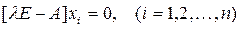 Для каждого из n характеристических чисел λi (i=1,2,…,n) матрицы А (в предположении, что все они различны) можно получить решение уравнения [ λ E – A ] x = 0. Это векторно-матричное уравнение можно представить в виде системы уравнений