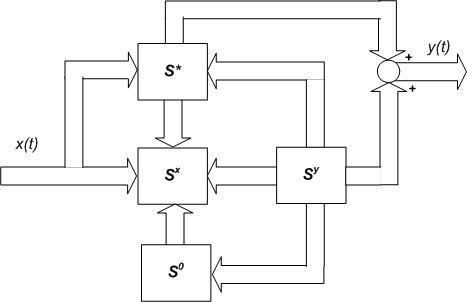 Рис. 2.14. Подсистемы: S* – управляемая и наблюдаемая; Sx –управляемая, но ненаблюдаемая; Sy – наблюдаемая, но неуправляемая; S0 – неуправляемая и ненаблюдаемая Требование управляемости и наблюдаемости всей системы состоит в том, чтобы система содержала только подсистему S*. Однако, например, при проектировании, если не учесть остальные подсистемы Sx, Sy, S0, то можно прийти к выводу о нормальной работоспособности S*,в то время как в действительности система в целом не работоспособна. Так, если подсистема S0 содержит неустойчивые частоты, то возбуждение этих частот при нулевых начальных условиях приведет к неустойчивости выхода. То же касается и подсистем Sx и Sy.
