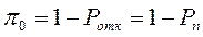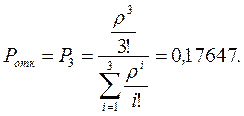 Рассмотрим многоканальную СМО,в которой выполняются следующие требования. · На вход системы поступает простейший поток заявок; · Каждый канал обслуживает одну заявку; · Время обслуживания подчиняется показательному закону; · Если хотя бы один канал свободен, то заявка принимается на обслуживание; · Заявка теряется, если поступает в тот момент, когда все каналы заняты, т.е. другими словами это система с отказами. Рассмотрим следующие критерии эффективности работы СМО: 1) вероятность отказа в обслуживании Pотк; 2) относительная пропускная способность π0; 3) абсолютная пропускная способность π.