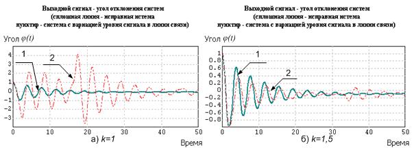 Применительно к рассматриваемому примеру САУ гашением колебаний груза на подвесе в качестве фактора влияния A может быть принят порог срабатывания логического элемента в схеме моделирования (в дальнейшем – параметр k), влияющий на интенсивность вариации сигнала возмущения по параметру системы a(t). В качестве его уровней можно принять различные значения порога, а результирующим признаком считать какой-либо из показателей качества переходных процессов: например, время регулирования или такой интегральный показатель качества как среднеквадратическое отклонение (СКО). Для того чтобы качественным образом оценить работу данной САУ, оптимально настроенной на подавление внешнего возмущения в виде нормально распределенного шума, достаточно визуально сравнить графики выходного сигнала – угла φ(t) отклонения подвеса от вертикали для случаев отсутствия и наличия возмущения по параметру (рис. 10.9).