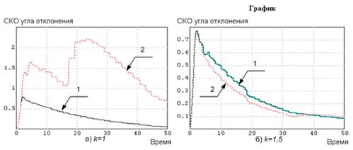 Видно, что система быстро справляется с внешним возмущением при отсутствии других возмущений (график 1). При дополнительном действии возмущения по параметру переходный процесс затухания колебаний значительно ухудшается (график 2), однако САУ за счет обратных связей продолжает бороться с возмущениями: колебания значительно медленнее, но все же затухают. Характер изменения текущего значения СКО для процессов изменения угла с рис. 10.9 показан на рис. 10.10.