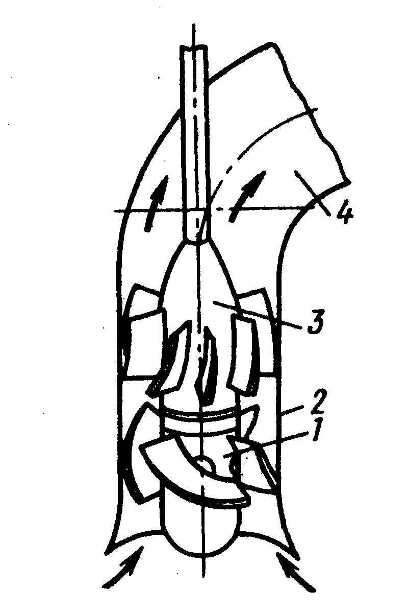 Рис. Осевой насос: 1 – рабочее колесо; 2 – камера рабочего колеса; 3 – выправляющий аппарат; 4 – отвод (трубчатое колено) Рабочее колесо осевого насоса состоит из втулки, на которой укреплено несколько лопастей, представляющих собой удобообтекаемое изогнутое крыло. Рабочее колесо насоса вращается в трубчатой камере, заполненной перекачиваемой жидкостью. При динамическом воздействии лопасти на жидкость за счет изменения скорости течения, давление над лопастью повышается, а под ней понижается. Благодаря образующейся при этом подъемной силе основная масса жидкости в пределах колеса движется в осевом направлении, что и определило название насоса. Для устранения вращательного движения жидкости (после прохождения рабочей камеры) служит выправляющий аппарат, через который она проходит перед выходом в коленчатый отвод, соединяемый с напорным трубопроводом. Осевые насосы выпускаются двух модификаций: - с жестко закрепленными на втулке лопастями рабочего колеса; - с поворотными лопастями рабочего колеса. Изменение в определенных пределах угла установки лопастей рабочего колеса позволяет поддерживать высокое значение КПД насоса в широком диапазоне изменения его рабочих параметров. По компоновке осевые насосы выпускают следующих конструкций: - с вертикальным валом; - с горизонтальным валом; - с наклонным валом. В качестве привода осевых насосов используются, как правило, электродвигатели синхронного и асинхронного типа, непосредственно соединяемые с насосом муфтой. Основные характеристики осевых насосов: