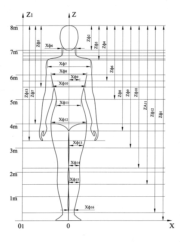 2. Расчет параметров фронтальной проекции типовой фигуры потребителя. В разделе приводится способ расчета параметров фронтальной проекции для мезоморфного типа пропорций. Для задания ГМФ используется только две проекции: фронтальная вид спереди и профильная. Схемы их построения приведены на рисунках 1-4. Поэтому сначала осуществляют расчеты параметров (Zфi и Хфi) фронтальной проекции ГМФ в форме таблицы 3. Таблица 3 – Расчеты параметров фронтальной проекции ГМФ