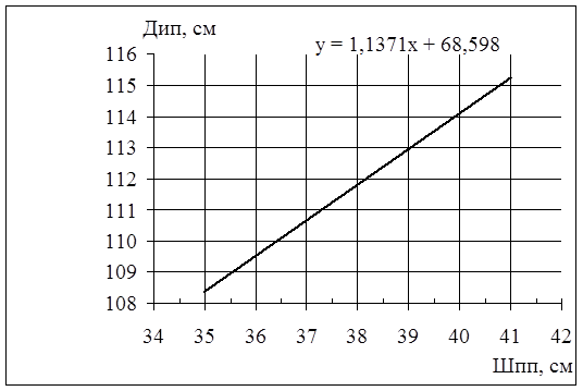 Рисунок П1 – График зависимости предпочтительной длины изделия (Дип)от ширины изделия в области плечевого пояса (Шпп)