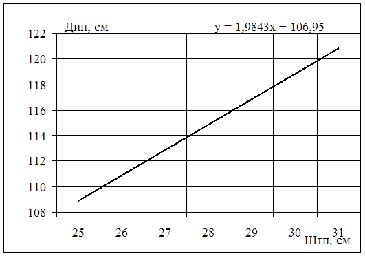 Рисунок П2 – График зависимости предпочтительной длины изделия (Дип) от проекционной ширины изделия по линии талии (Штп) во фронтальной проекции
