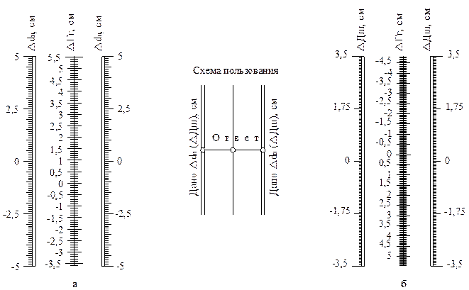Рисунок П3 – Номограммы для определения изменения глубины выреза горловины в зависимости от изменения величины плечевого поперечного диаметра Ddп (а) и длины шеи Дш (б)