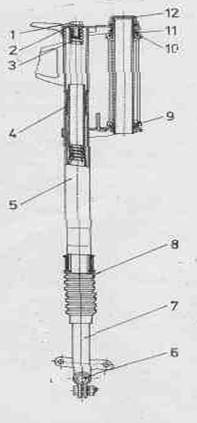 I — болт; 2 — верхний мостик; 3 — пружина; 4 — втулка капроновая; 5 — остов вилки; 6 — втулка; 7 — труба внутренняя; 8—чехол; 9 — подшипник 876707; 10 — шайба защитная; 11 — гайка; 12 — контргайка. Передняя вилка (Рис. 8) телескопического типа с пружинными амортизаторами. Регулировка подшипников рулевой колонки производится в собранном состоянии. Для этого следует отпустить контргайку 12 и.вращением гайки 11 добиться положения, когда отсутствует ощутимый люфт в подшипниках, и поворот вилки осуществляется без заеданий. Разборку передней вилки производите в следующем порядке: — снимите переднее колесо (см. «Колеса»); — выверните болт I, и труба внутренняя 7 с пружиной 3 выходят вниз; — пружину от трубы отсоедините вращением против часовой стрелки; — отверните контргайку 12, снимите шайбу; — снимите верхний мостик 2 и, отвернув гайку 11, освободите остов.вилки от рамы. Сборку вилки производите в обратном порядке.
