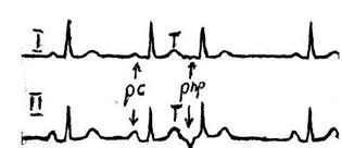 Рис.22. Предсердная экстрасистола. 3-ий комплекс предсердная экстрасистола начинающаяся с Рпр предсердного генеза, отличающегося от Рс синусового генеза.